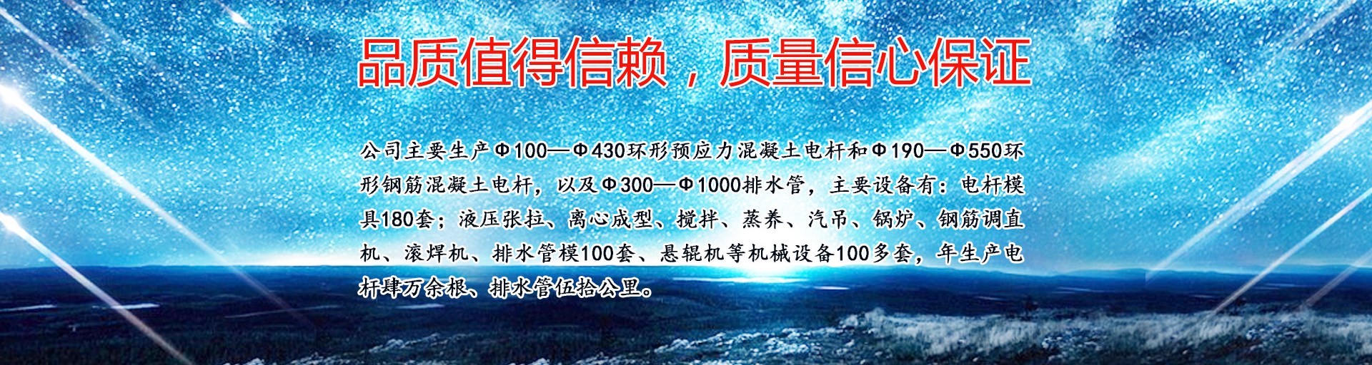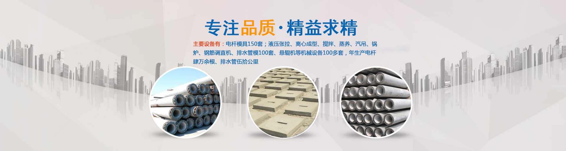 公司主要生產(chǎn)ф100—ф430環(huán)形預(yù)應(yīng)力混凝土電桿和ф190—ф550環(huán)形鋼筋混凝土電桿,以及ф300—ф1000排水管,主要設(shè)備有:電桿模具180套;液壓張拉、離心成型、攪拌、蒸養(yǎng)、汽吊、鍋爐、鋼筋調(diào)直機(jī)、滾焊機(jī)、排水管模100套、懸輥機(jī)等機(jī)械設(shè)備100多套,年生產(chǎn)電桿肆萬余根、排水管伍拾公里。……